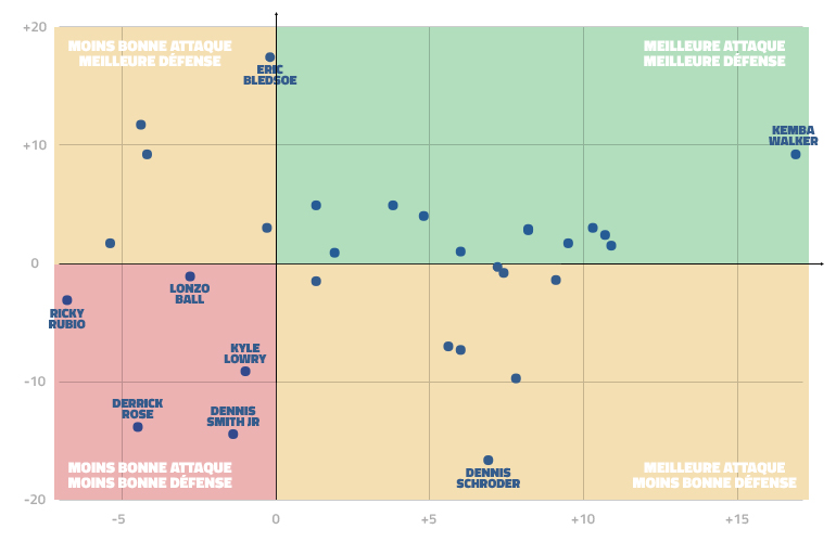 En représentant les ratios offensif et défensif On/Off de tous les meneurs titulaires depuis le début de saison, on voit ainsi que Dennis Schröder fait partie des huit qui rendent l’attaque de leur équipe statistiquement meilleure, tout en rendant la défense statistiquement plus faible. Aucun autre meneur ne provoque d’ailleurs un tel changement négatif en défense…