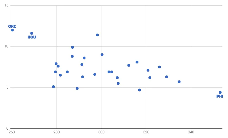 Bien sûr, le fait d'intégrer deux All-Stars comme Carmelo Anthony et Paul George n'est pas simple et prend du temps. Mais depuis le début de la saison, on a ainsi souvent eu l'impression que les trois hommes jouaient davantage les uns à côté des autres, plutôt qu'ensemble. C'est d'ailleurs assez marquant si on représente le pourcentage d'isolations jouées par une équipe (axe vertical) par rapport au nombre total de passes par match (axe horizontal).