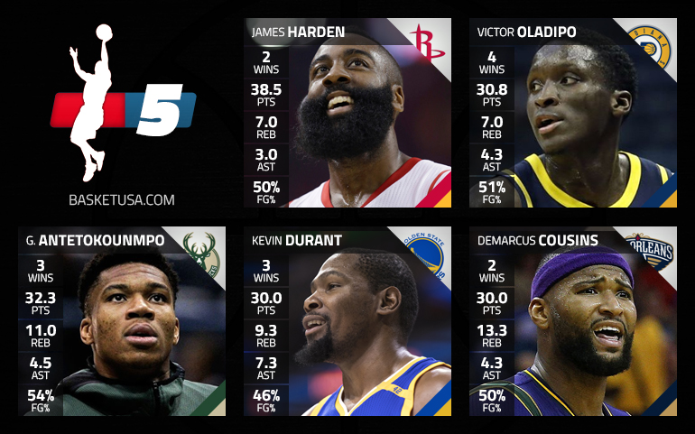 Pour le frontcourt, le choix fut beaucoup plus délicat avec un LeBron James qui a encore brillé. Mais les performances de Giannis Antetokounmpo sont également à noter et on opte cette semaine pour le Grec, tandis que Kevin Durant se rapproche du cercle. Le MVP 2014 a pris les choses en main alors que Stephen Curry est blessé, et il s’occupe de tout à Golden State !