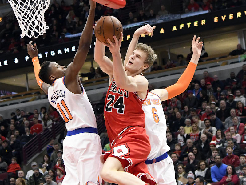 Les Knicks démarrent sur un bon rythme, avec Doug McDermott titulaire pour la quatrième fois de la saison, et porté par un Porzingis inspiré (10-5). Mais les Bulls ne se laissent pas endormir et réagissent par Valentine et surtout Robin Lopez, qui gêne Kanter par sa « lourdeur » dans la raquette (11-10). Un duel Markkanen-Porzingis se met en place et les deux tours jumelles européennes se répondent du tac au tac : un panier plus la faute pour le Finlandais, et un tir à dix mètres pour le Letton. L’entrée de Frank Ntilikina donne un coup de boost supplémentaire aux siens, qui prennent une belle avance après douze minutes (28-17).