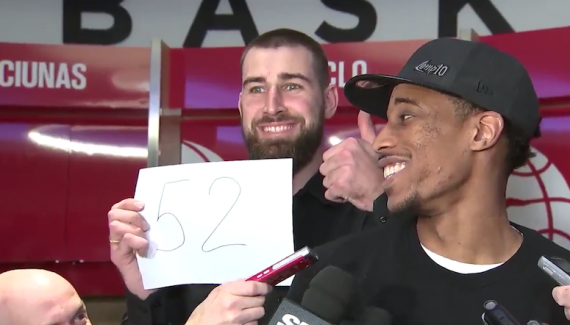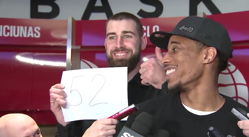 C’est l’une des images sympas de la nuit : Jonas Valanciunas qui s’invite à l’interview d’après-match de DeMar DeRozan avec une feuille, inspirée par celle affichée en son temps par Wilt Chamberlain, remplie par un « 52 ». Soit le nombre de points inscrits par l’arrière contre les Bucks. Le Raptor est encore loin du mythique homme aux 100 points mais il est tout de même rentré dans l’histoire à sa façon. En battant le record de la franchise canadienne.