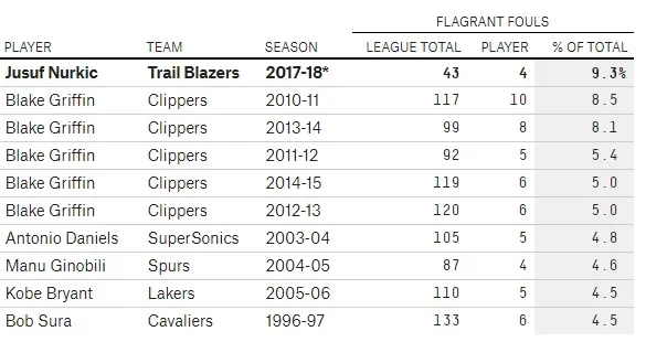 En effet, FiveThirtyEight nous apprend qu'il y a eu pour l'instant 43 fautes flagrantes sifflées, et à lui tout seul, Jusuf Nurkic en subit près de 10%, un chiffre jamais atteint depuis plus de 20 ans, même par Blake Griffin.