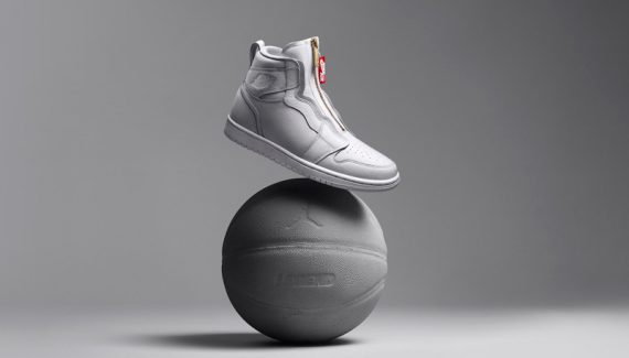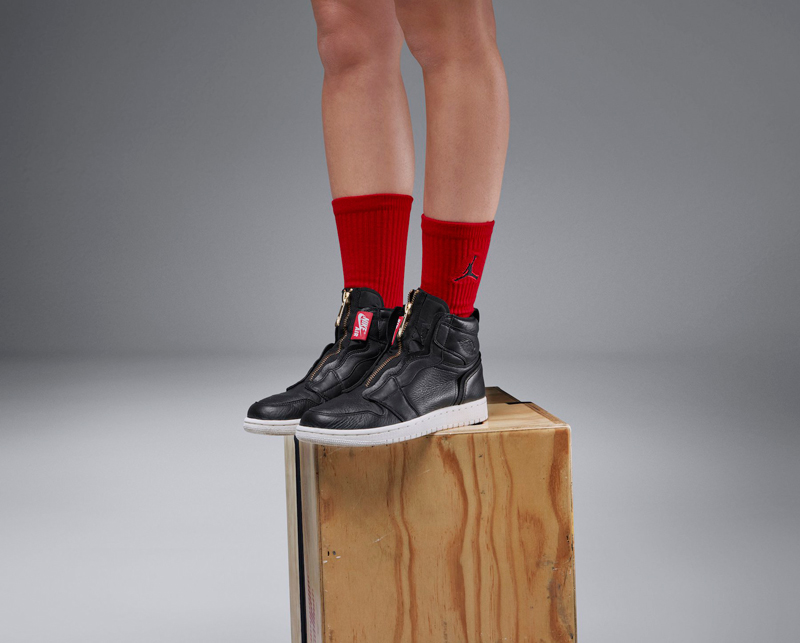 Les lacets ? La virgule ? Dehors. Sur ce nouveau modèle, uniquement destiné aux femmes pour le moment, c’est une fermeture éclair dorée qui assure la fermeture. Une imposante étiquette rouge est aussi présente pour rappeler, tout de même, qu’on a bien affaire à un produit Nike. Le logo Jordan est aussi gravé de manière plus discrète sur la cheville.