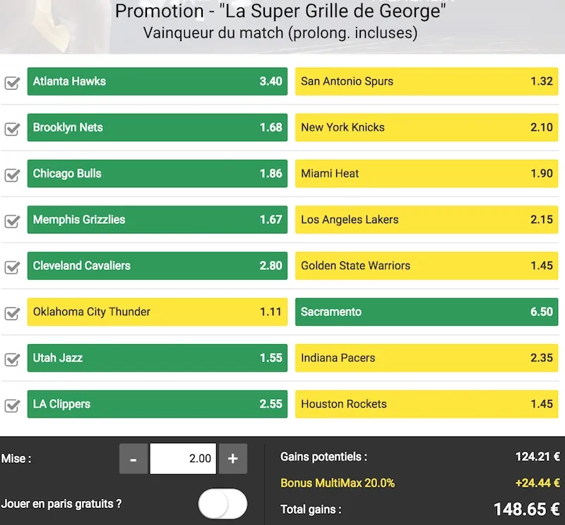 Il s’agit d’une grille de 8 matches, et il faut donc faire mieux que George qui a choisi de miser sur des grosses cotes : New York, Miami, Indiana et LA Lakers.