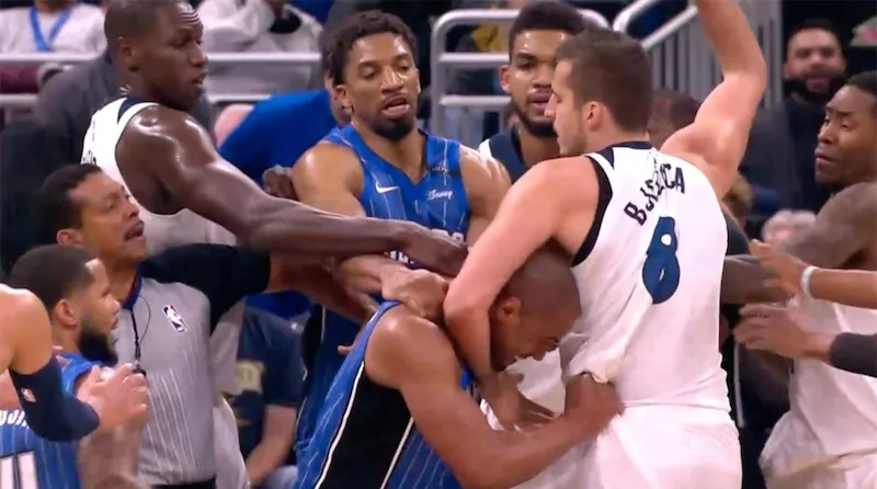 /https%3A%2F%2Fwww.basketusa.com%2Fapp%2Fuploads%2F2018%2F01%2Ffight-timberwolves-magic-punch.jpg) Arron Afflalo et Nemanja Bjelica n'ont pas la réputation d'être les plus grandes teignes de la NBA, et pourtant cette nuit, ils se sont retrouvés au cœur d'une altercation, au deuxième quart-temps du match opposant Magic et Wolves. Ce qui n'était qu'une banale lutte entre les deux hommes, au rebond, s'est transformée en début de baston. L'arrière du Magic a tenté de décrocher une droite en direction du Serbe, qui a esquivé et est parvenu à le maitriser en plaçant sa tête sous son bras.