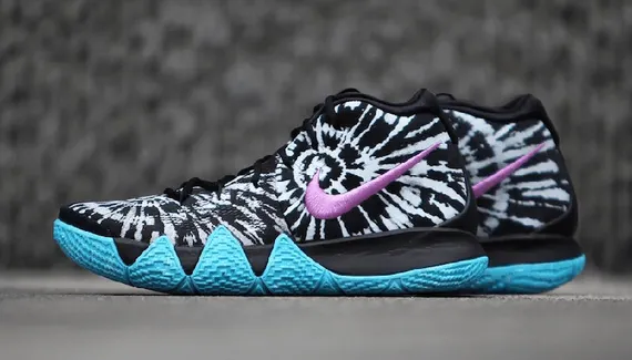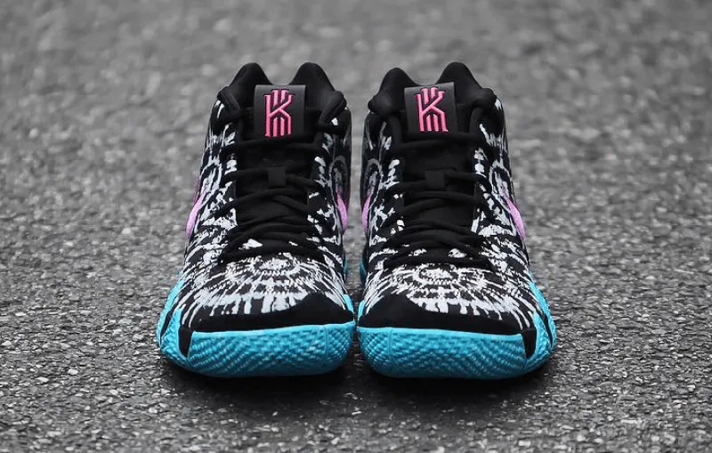 Pour le meneur des Celtics, la Kyrie 4 s'inspire de Venice Beach et de sa foule de touristes. Le motif très psychédélique est surmonté par une virgule rose. Le tout est posé sur semelle qui rappelle l'océan tout proche.