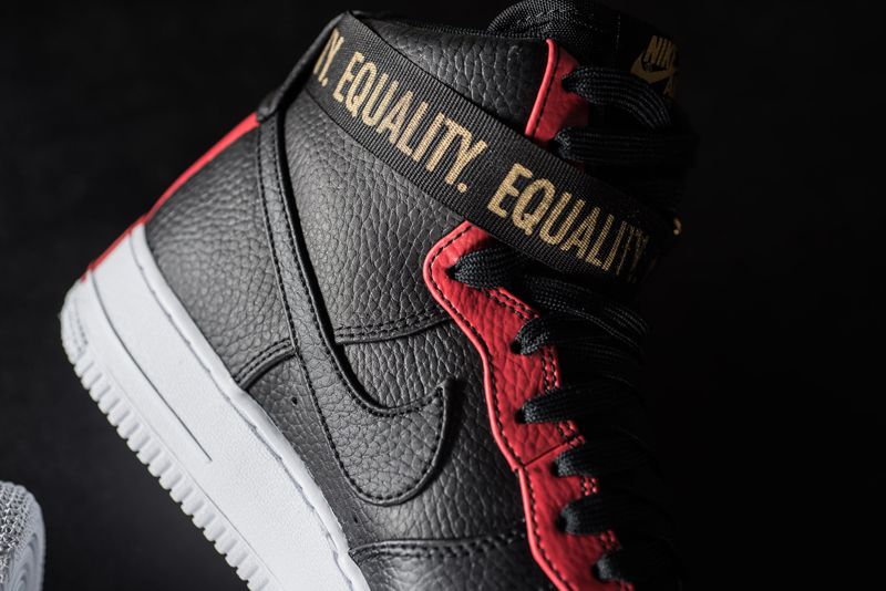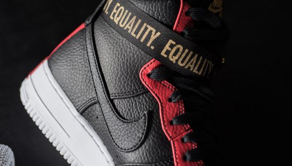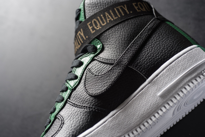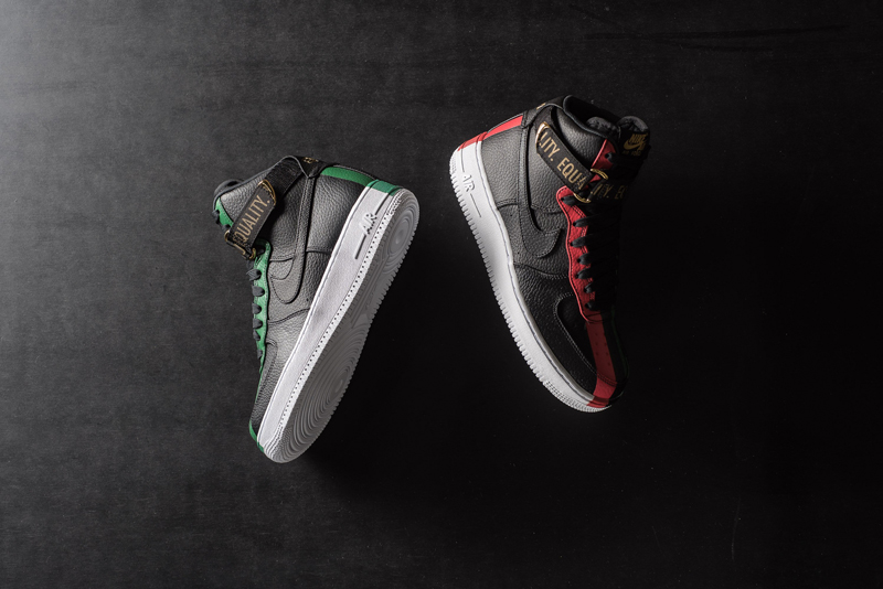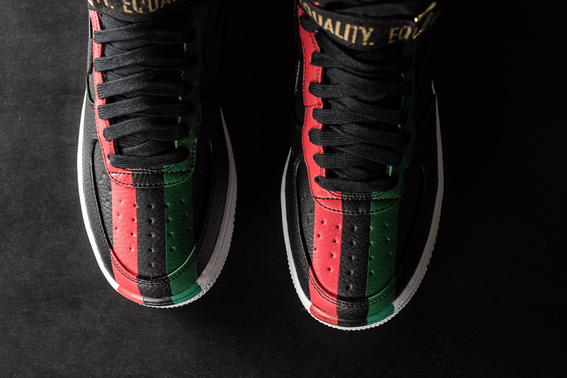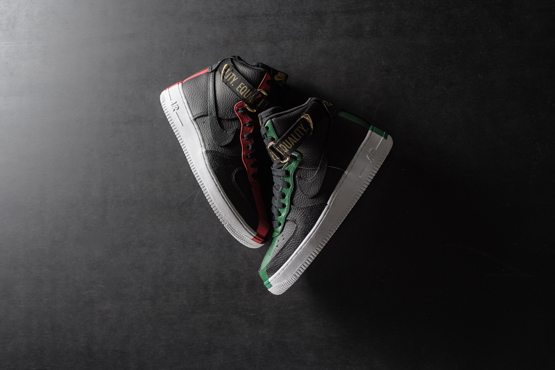 La marque a la virgule a encore des choses dans les cartons, puisque la version haute de la Air Force 1 va également se parer des couleurs du drapeau panafricain. Des touches de rouge et de vert viennent habiller une tige en cuir noir posée sur une semelle blanche.