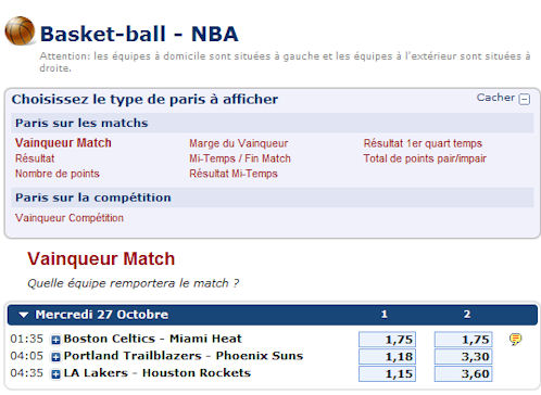 Plusieurs types de paris s’offrent à vous. Vous pouvez parier sur le champion NBA 2011 ou les vainqueurs de Conférence. L’inconvénient, bien sûr, c’est qu’il faut patienter jusqu’en avril et en juin pour avoir le résultat…