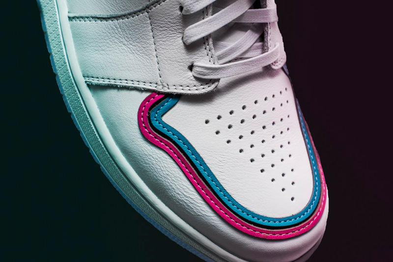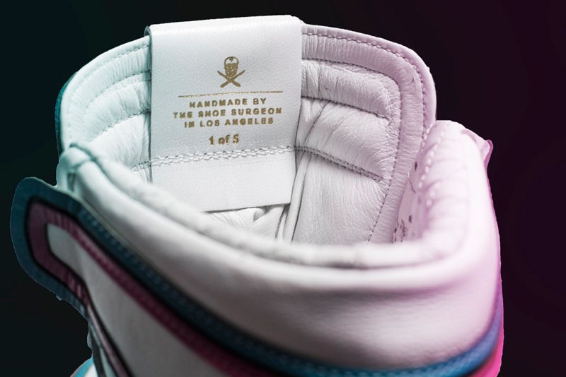 TheShoeSurgeon a décidé de prolonger le plaisir en utilisant la même combinaison de couleurs sur la Air Jordan 1. Le résultat est encore une fois magistral. C’est surtout dans les détails que le travail de l’artiste se distingue. Le nom de la ville apparaît à travers la semelle translucide. L’inscription se retrouve aussi sur le cuir de la languette. Un cuir qui est matelassé dans le col pour donner un aspect plus luxueux.