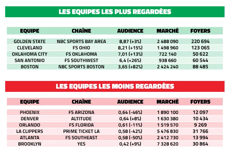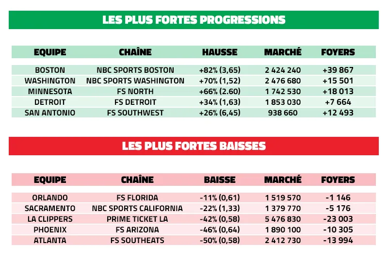Si on parle souvent des audiences nationales de la NBA sur ESPN ou ABC, le Sports Business Journal a fait une plongée intéressante dans les audiences locales, montrant que la ligue progressait aussi à ce niveau-là.