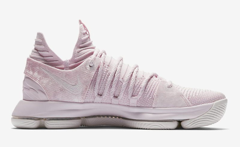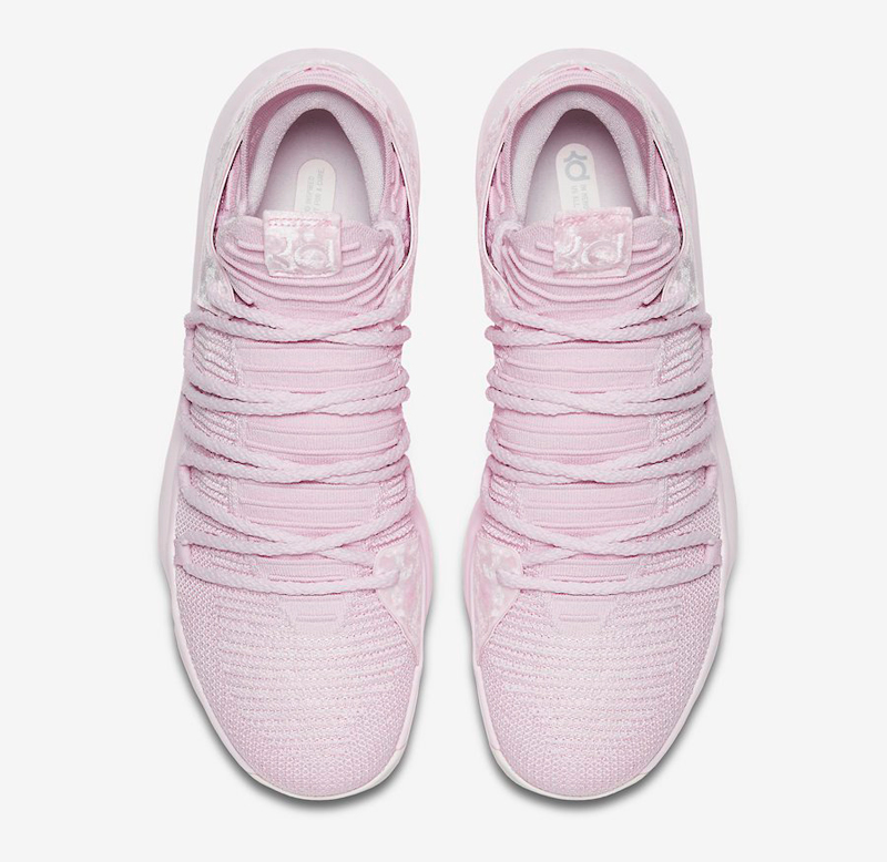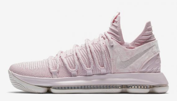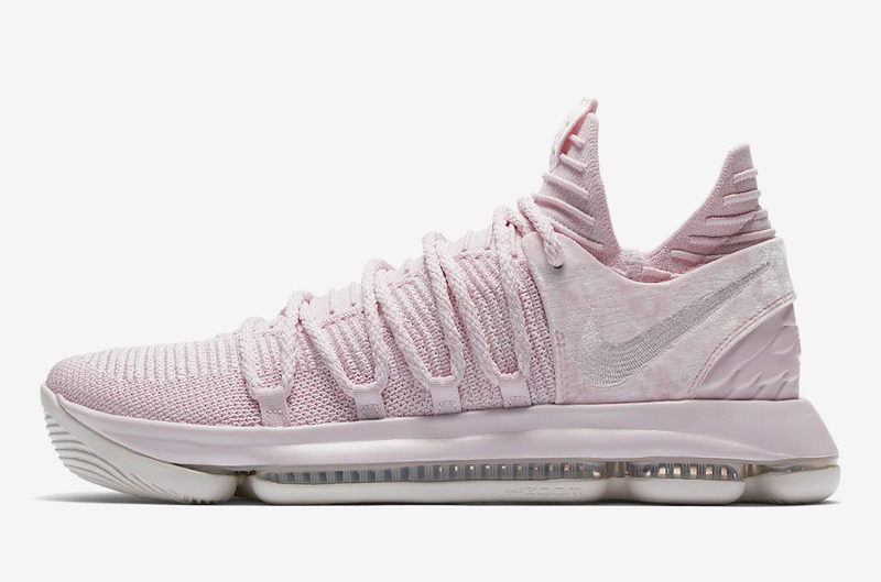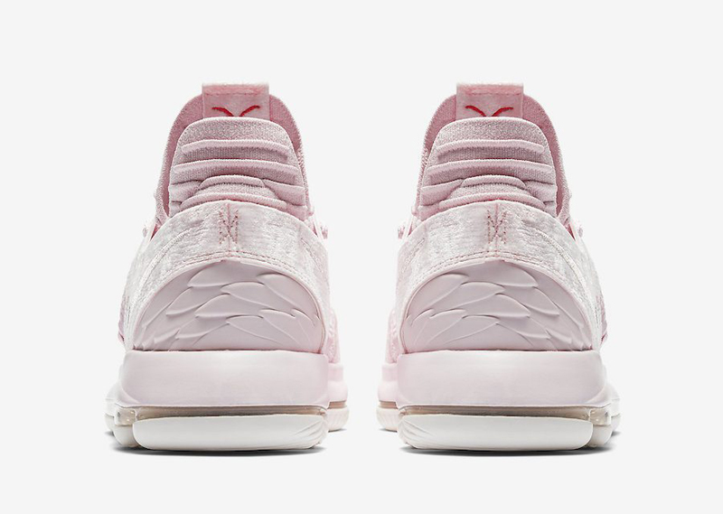 Pas de noir ou de fleurs pour cette fois. Sur la KDX, Nike a opté pour un rose très doux, que ce soit sur la teinte ou la matière utilisée au niveau du talon. Le ruban rouge de la fondation Kay Yow, qui oeuvre contre le cancer, est présent à l’intérieur de la languette.