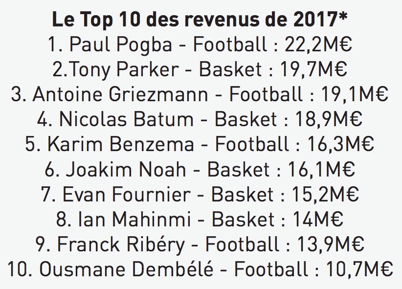 Tony Parker est deuxième avec 19.7 millions d’euros, soit 100 000 euros de plus qu’en 2016. Quatre autres français de la NBA sont dans le Top 10 : Nicolas Batum, Joakim Noah, Evan Fournier et Ian Mahinmi.