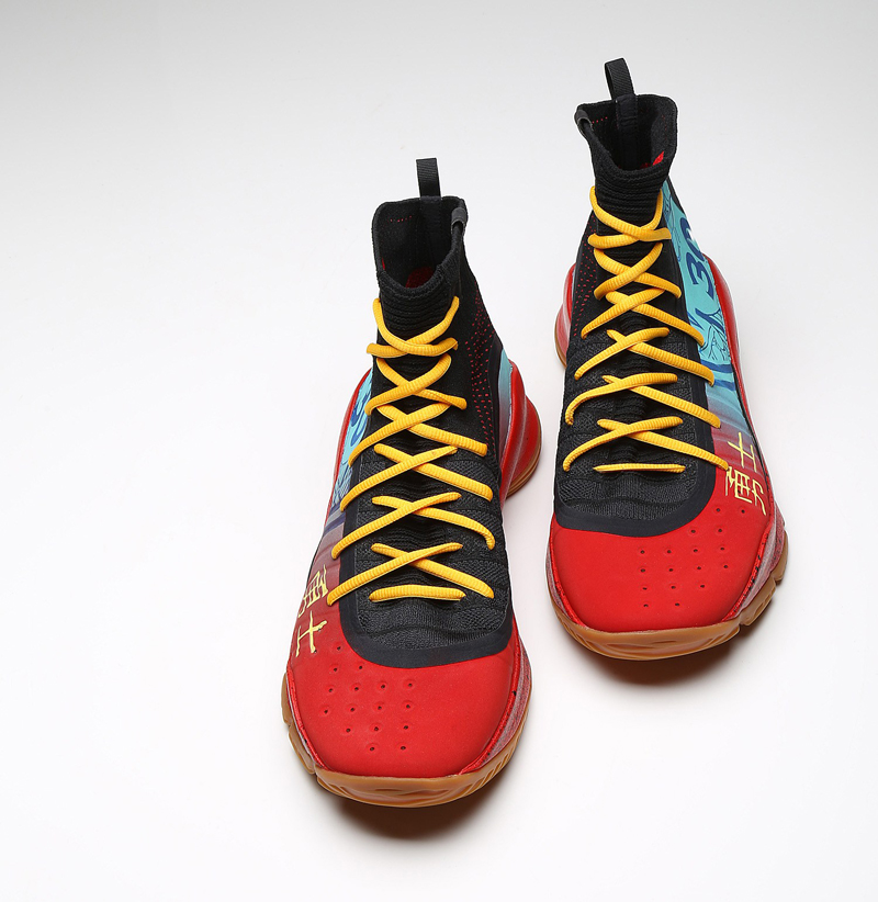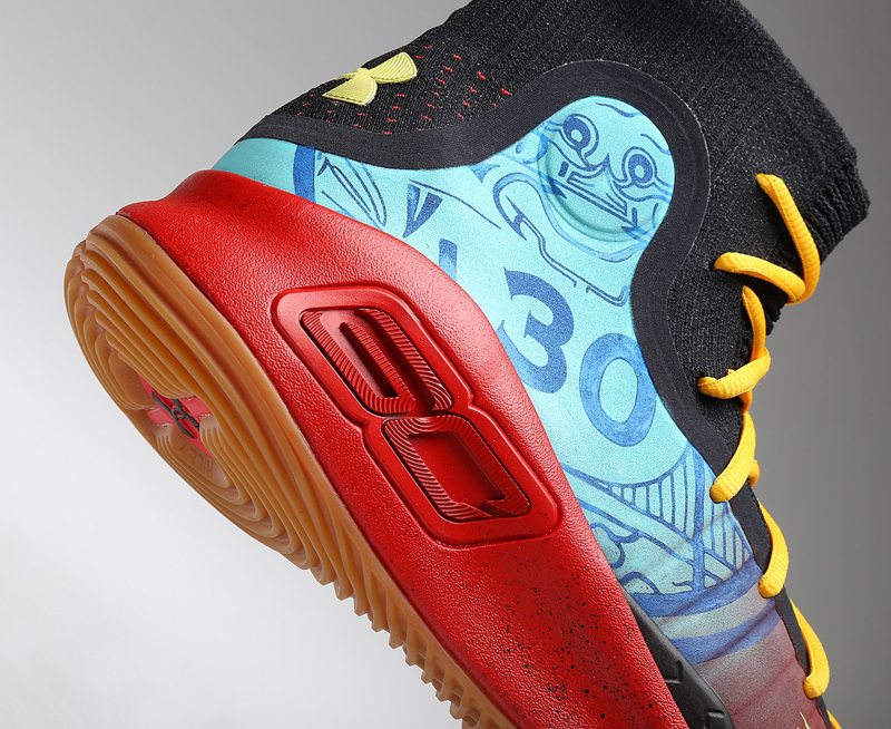 Ne cherchez pas ce coloris chez votre revendeur habituel, il n’y sera pas. Contre le Thunder, c’est une Curry 4 personnalisée par Mache Custom que portait Stephen Curry.