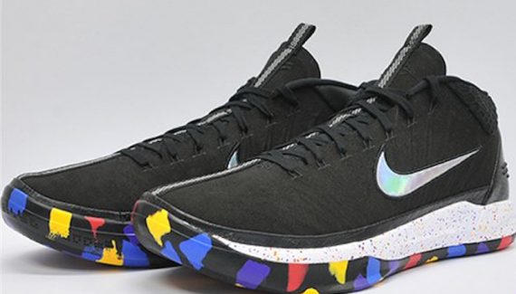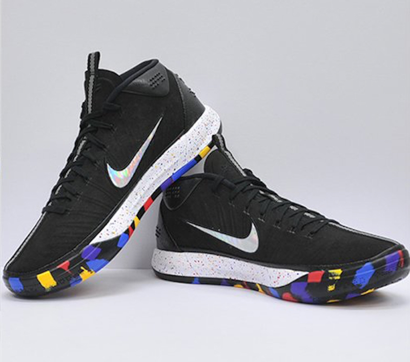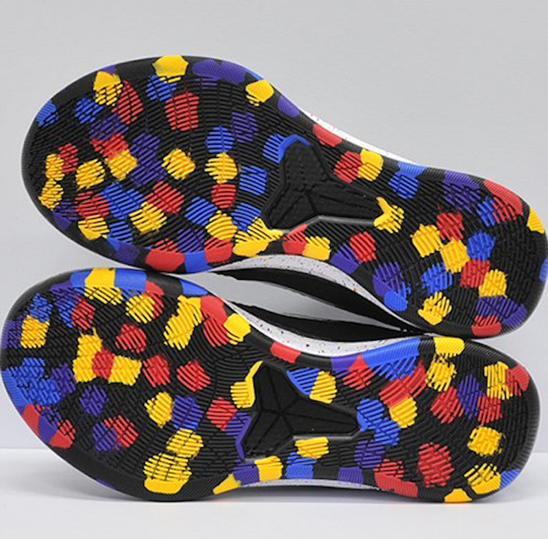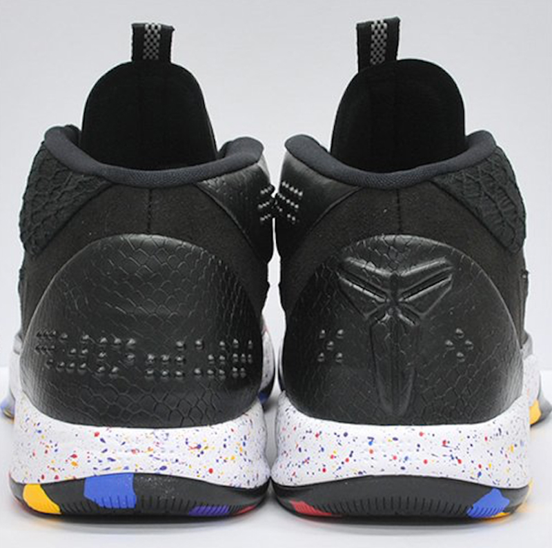 Face au blanc de la chaussure de Paul George, celle du Black Mamba opposera une tige noire. Elle proposera elle aussi une semelle externe décorée par des coups de pinceau rouge, jaune, violet et bleu.
