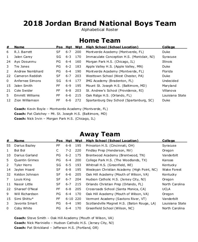 Avant de rejoindre Duke, les deux ailiers auront donc l’occasion de faire montre de leur complicité. A leurs côtés, deux autres recrues des Blue Devils : le meneur Tre Jones, petit frère de Tyus, et l’ailier Cameron Reddish.