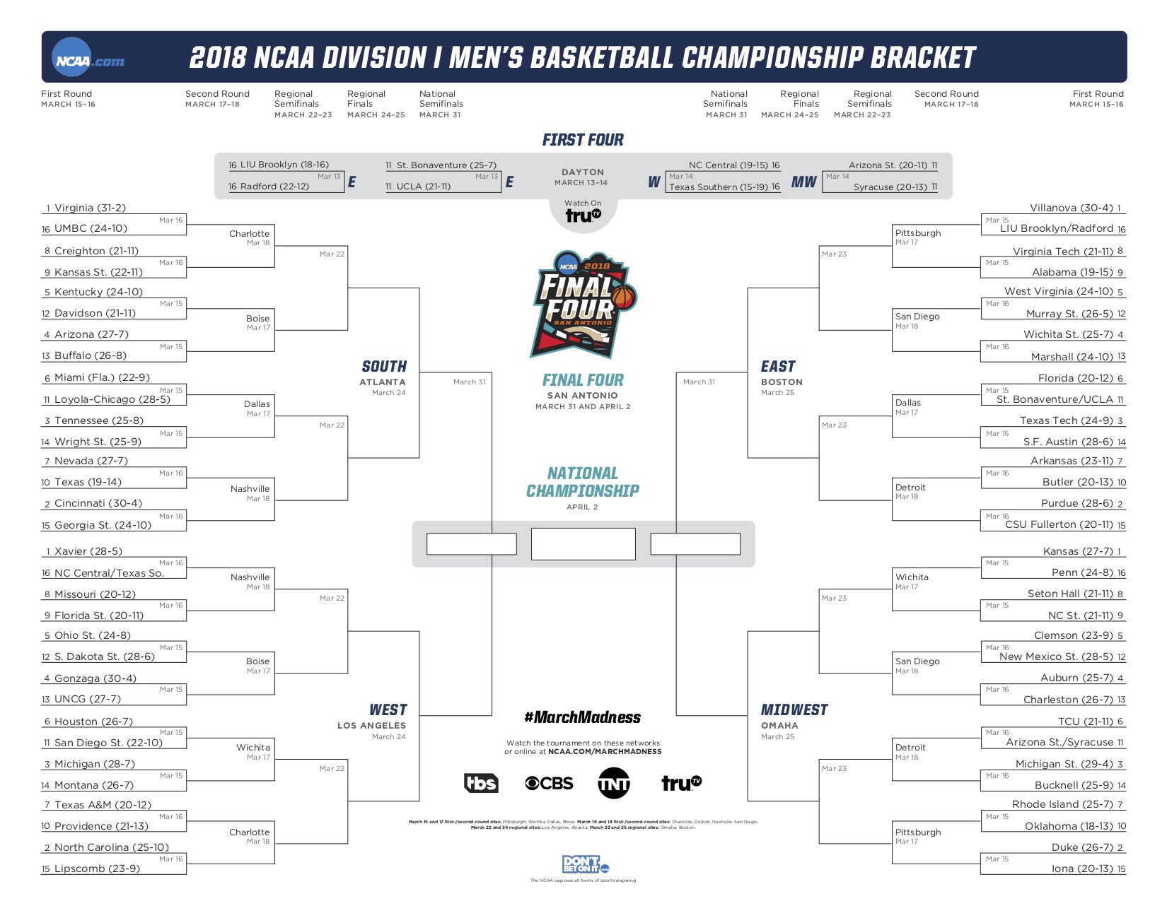 C’est fait, la NCAA a dévoilé le fameux “bracket” du tournoi 2018 avec 68 universités sur la ligne de départ, divisées dans quatre parties régionales : East, West, Sud et Midwest. Ça débute dès demain avec les rencontres du First Four, le tour préliminaire, et ça se terminera du 31 mars au 2 avril à San Antonio avec le traditionnel Final Four.
