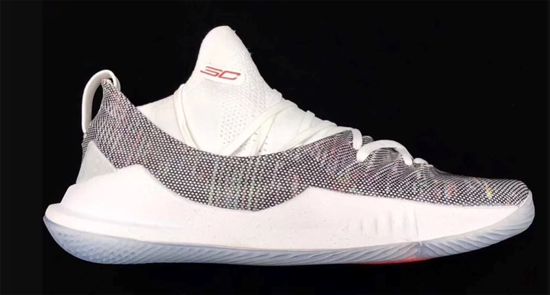 La coupe est très basse, avec un chausson en tissu, qui est entouré par une matière qui semble plus renforcée. On peut noter que le chausson présent sur la première image volée semblait être en Néoprène. Apparemment, il s’agissait d’un prototype de travail, puisqu’on a donc désormais affaire à un tissu qui ressemble à celui de la Curry 4. Sous le pied, la plaque placée sous le voûte plantaire ressemble aussi à celle du modèle actuel.
