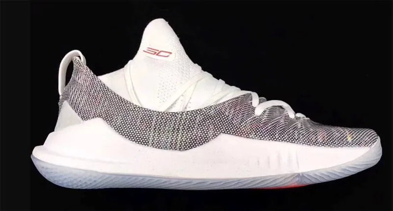 La coupe est très basse, avec un chausson en tissu, qui est entouré par une matière qui semble plus renforcée. On peut noter que le chausson présent sur la première image volée semblait être en Néoprène. Apparemment, il s'agissait d'un prototype de travail, puisqu'on a donc désormais affaire à un tissu qui ressemble à celui de la Curry 4. Sous le pied, la plaque placée sous le voûte plantaire ressemble aussi à celle du modèle actuel.