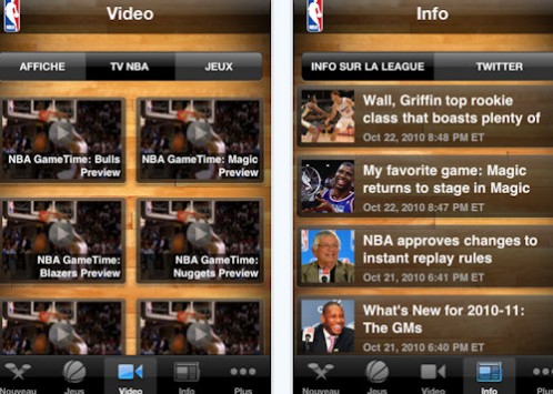 Un onglet Info sur la league qui pointe vers des news en anglais. Un onglet Twitter qui affiche les tweets envoyés sur le compte NBA.