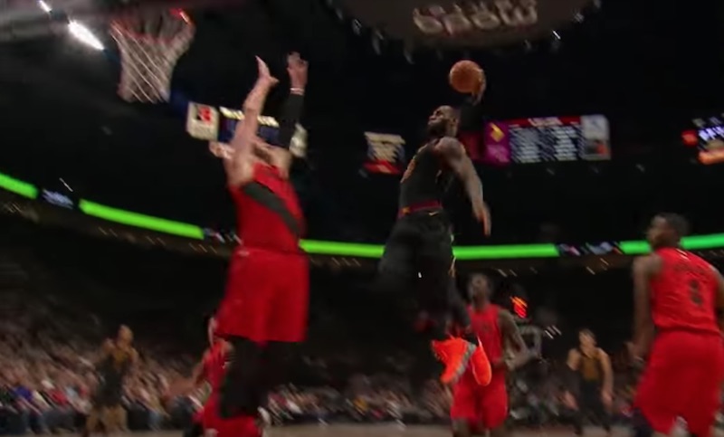 Fâché, le King a fait exploser sa colère après seulement cinq minutes au Moda Center. En tête de raquette, l’ailier de Cleveland part sur sa gauche et profite de la mauvaise rotation défensive pour prendre de la vitesse. Lancé, LeBron décolle et écrase le ballon dans le cercle. Il y a tout : la puissance, la hauteur, l’amplitude et une violence terrible pour claquer ce poster sur la truffe de Jusuf Nurkic, pourtant un sacré roc à faire bouger.
