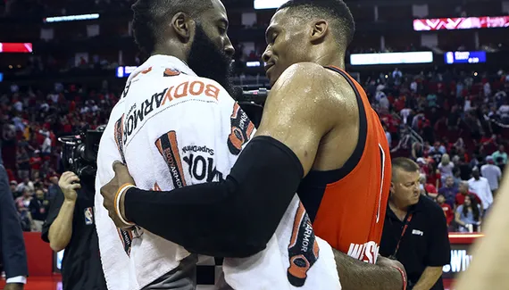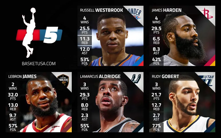 Encore une fois, les candidats sont nombreux sur le backcourt avec le duo Damian Lillard – CJ McCollum à Portland, DeMar DeRozan ou encore Ben Simmons. Impossible néanmoins de ne pas choisir Russell Westbrook, absolument monstrueux face aux Raptors, à la tête d'un Thunder qui enchaîne les victoires. Tout comme James Harden, malgré un peu de maladresse.