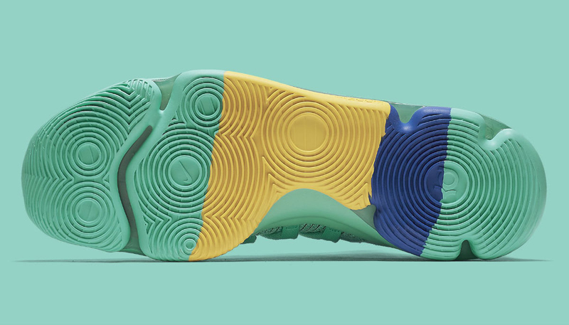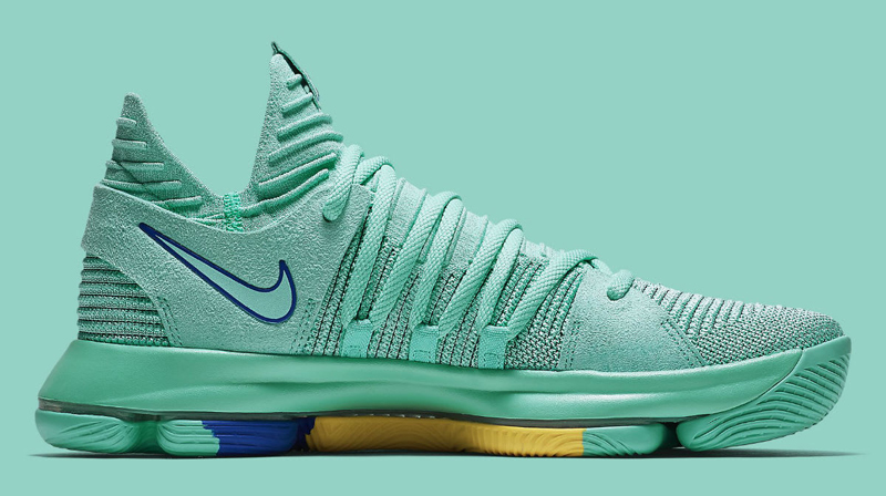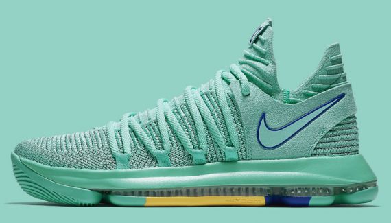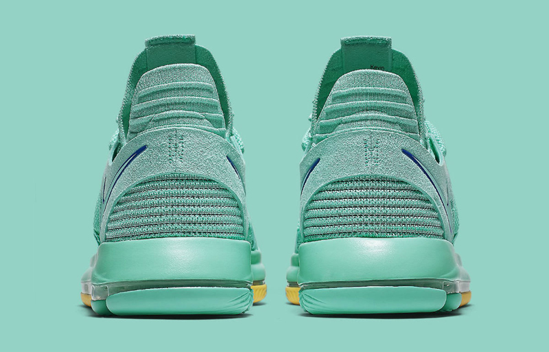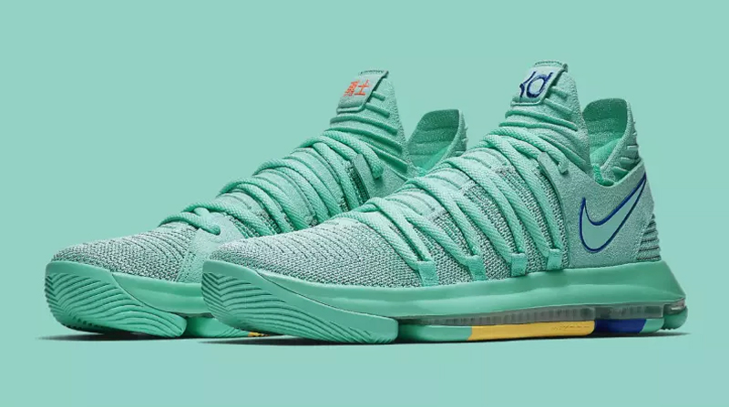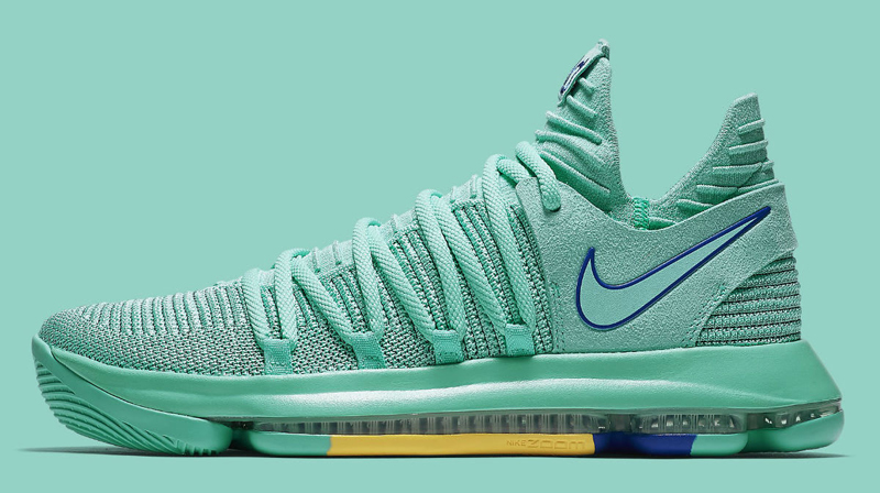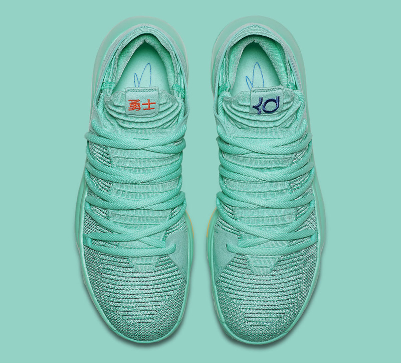 Pour la deuxième vague des coloris “City Edition”, la KD10 arbore donc un vert très clair. Une broderie sur la languette du pied droit ajoute un clin d’oeil au quartier de China Town. Sous la semelle, le bleu et le jaune de l’équipe championne en titre sont présents.