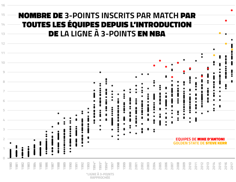 En effet, les Rockets tentent presque 43 paniers à 3-pts par rencontre. Conséquence : il y a deux ans, les Warriors dépassaient, pour la première fois de l’histoire, les 1 000 paniers primés quand Houston est sur les bases d’une saison à presque 1 300 en 2017-2018 !