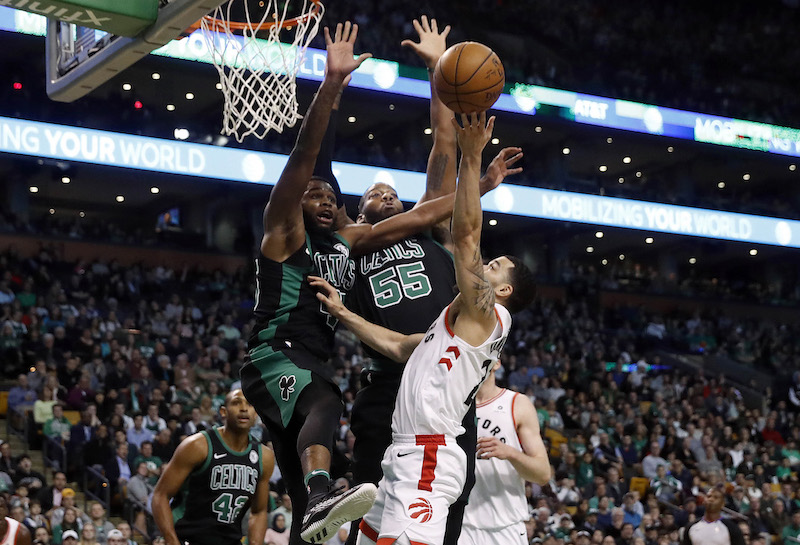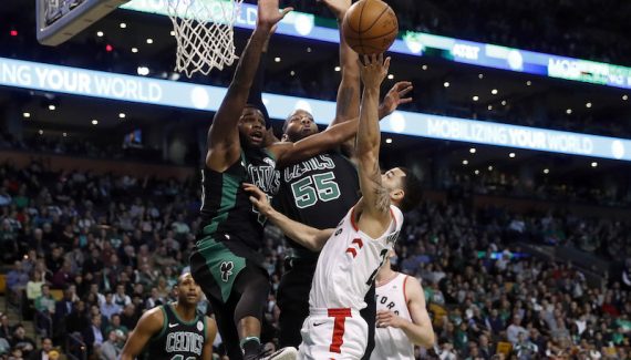 Le choc entre les deux premiers de la conférence Est tient toutes ses promesses dans ce début de rencontre. Le duo Valanciunas/Ibaka se montre très intéressant, et les deux hommes profitent des largesses défensives adverses pour prendre le contrôle de la raquette (18-13). Dans la peinture ou à longue distance, Aron Baynes réalise lui aussi un très bon début de rencontre, et sa détermination permet à son équipe de rentrer enfin dans son match et d’égaliser (24-24). La prestation de Baynes donne des idées à Terry Rozier (21 points) qui agresse systématiquement la défense canadienne. Après 12 minutes, les Raptors mènent de deux petits points (33-31).