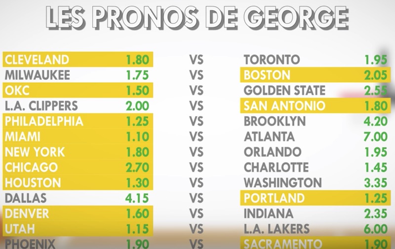 Ce n’est pas 1 000 mais 2 000 euros que Unibet met en jeu ce soir pour ceux qui veulent défier la grille de George Eddy. Il y a 13 matches au programme, et il y a de belles affiches comme Cleveland – Toronto, Milwaukee – Boston, OKC – Golden State et LA Clippers – San Antonio.