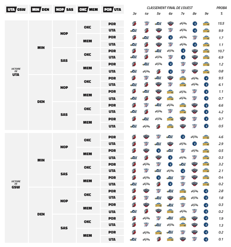 Mais tout peut encore bouger au niveau du classement. Car si les Rockets seront premiers et que les Warriors seront de leur côté deuxièmes de la conférence, impossible pour eux de savoir qui ils vont affronter au premier tour des playoffs. Sur Reddit, les internautes se sont ainsi mobilisés pour déterminer les 32 scénarios encore possibles dans cette folle course à l’Ouest.