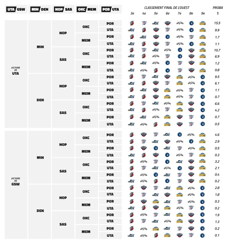 Mais Houston peut encore affronter les Wolves, le Thunder, les Spurs ou encore les Pelicans. Quant aux Warriors, ils peuvent encore croiser les Spurs, le Thunder, les Wolves, les Nuggets, les Pelicans et même le Jazz.