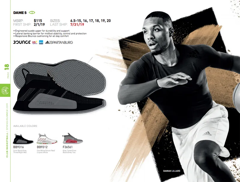 Le premier aperçu du design de la Dame 5 est déjà en ligne. Il ne s’agit pas vraiment d’une fuite, puisque c’est adidas qui a publié son catalogue destiné aux clubs pour la saison printemps/été 2019.