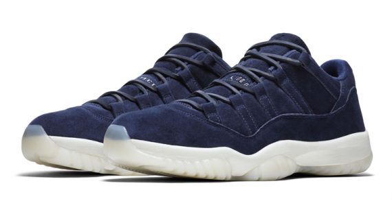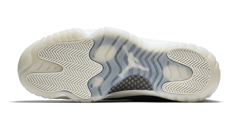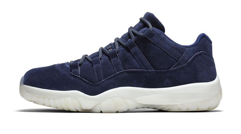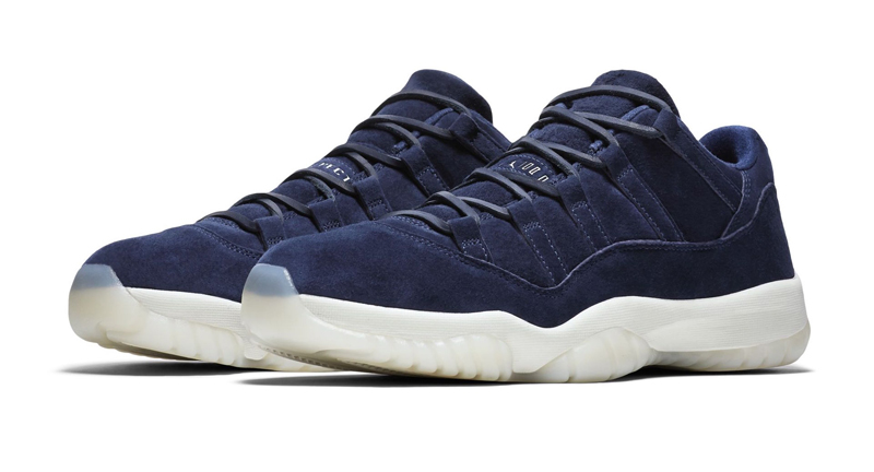 Pour l’occasion, la Jordan 11 perd son emblématique empiècement verni. La tige est totalement en daim. Des lacets en cuir complètent l’ambiance premium. Le tout est posé sur une semelle translucide blanche et le numéro 2 de Jeter est brodé sur le talon.
