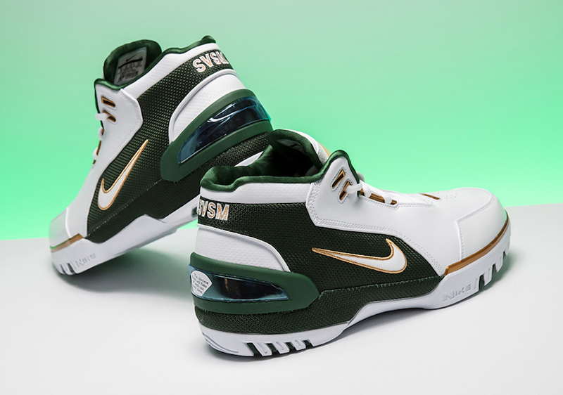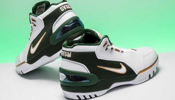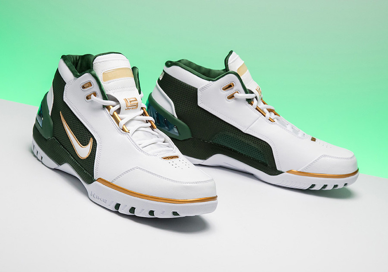 Mais le coloris posé sur cette Generation revient encore plus loin en arrière, puisque la combinaison vert/blanc/or est celle du lycée St.Vincent – St Mary, qui était évidemment celui de James avant son arrivée dans la grande ligue. Pour l’anecdote, l’établissement était équipé par adidas à l’époque où LBJ y jouait.