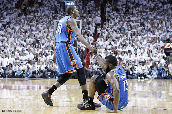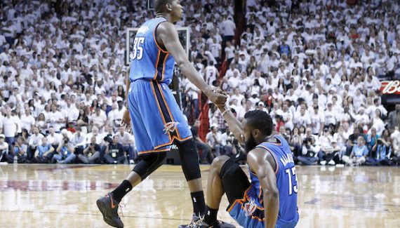 Finalistes en 2012 sous les couleurs du Thunder, dominé par le Heat en finale, James Harden et Kevin Durant sont désormais adversaires comme leaders offensifs de leurs équipes respectives. Le premier est le grand favori pour le trophée de MVP, un trophée remporté par son ancien coéquipier en 2014. L’ancien sixième homme d’OKC a rattrapé son retard, et il se souvient de leurs entraînements à OKC.