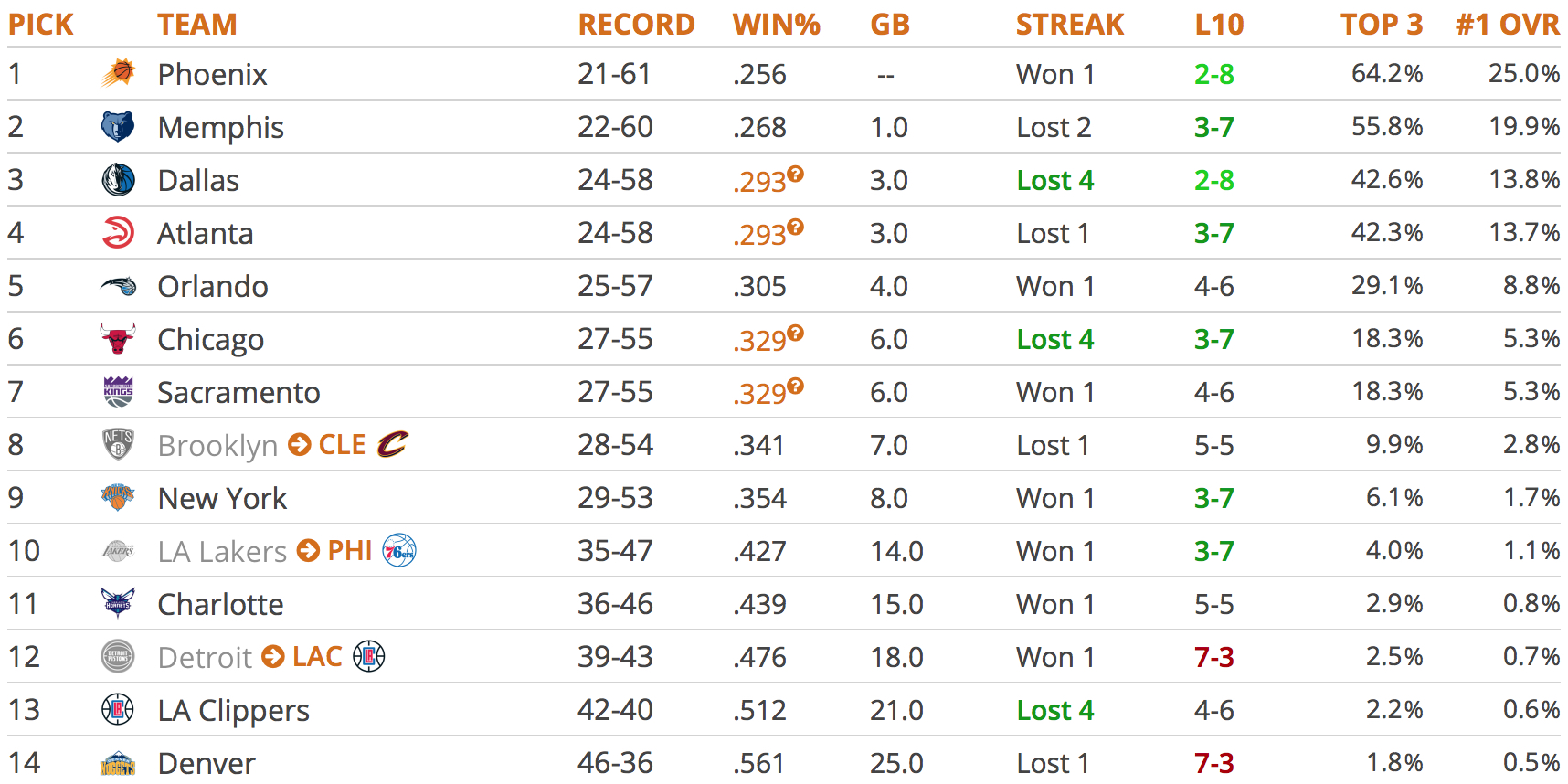 Voici le tableau des probabilités (en %) pour chaque équipe. Les Suns sont assurés d’obtenir l’un des quatre premiers choix, et s’ils possèdent 1 chance sur 4 de choisir en 1er, ils ont presque deux chances sur trois de sélectionner dans le Top 3.