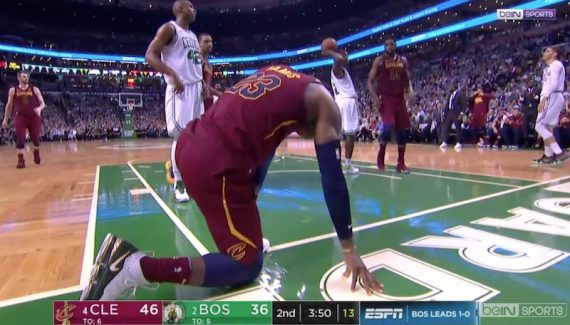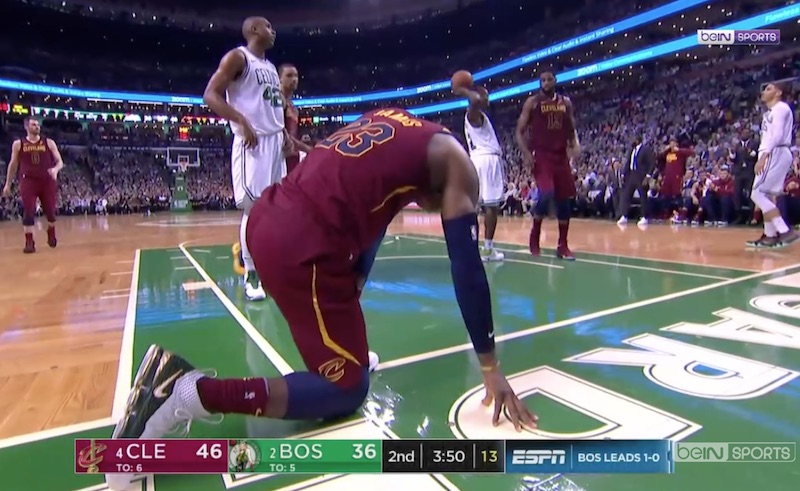 L’image d’un LeBron James, un genou à terre, est symbolique puisque Cleveland est mené 2-0 dans cette série. Sur un drive ligne de fond, la star de Cleveland se prend l’épaule de Jayson Tatum en plein visage. Il pose un genou à terre, cherche à retrouver ses esprits, et finalement il rejoint les vestiaires presque groggy.