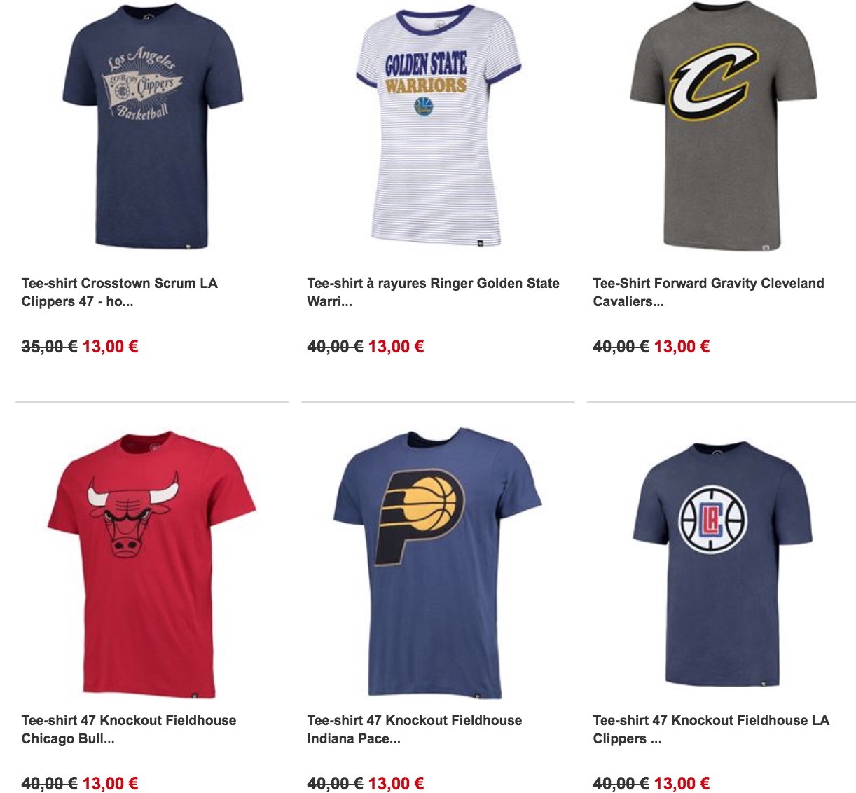 Quelle que soit votre franchise NBA préférée, vous trouverez votre bonheur puisque la NBA propose de grosses promotions sur tous les T-shirts. Qu’ils coûtent au départ 18, 25 ou 40 euros, ils sont à 13 euros ! On en trouve même à 10 euros…