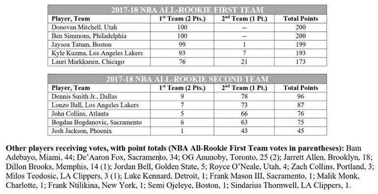 Du côté de la deuxième équipe, on retrouve Dennis Smith Jr (Mavericks), Lonzo Ball (Lakers), John Collins (Hawks), Bogdan Bogdanovic (Kings) et Josh Jackson (Suns). Ce dernier devance Bam Adebayo (Heat) d'un petit point. De son côté, Frank Ntilikina (Knicks) a reçu un vote.