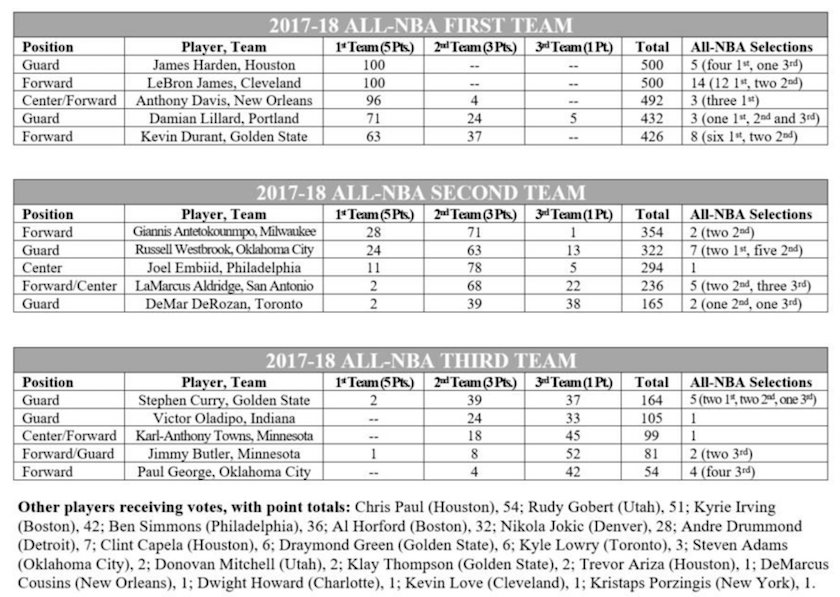Si James Harden et LeBron James sont élus à l’unanimité dans le premier cinq, ils sont accompagnés d’Anthony Davis, Kevin Durant et… Damian Lillard ! Le meneur de Portland décroche pour la première fois une place dans le meilleur cinq de l’année, et c’est le premier Blazer depuis Clyde Drexler en 1992.