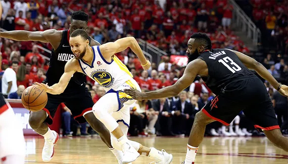 Pour le cinquième match consécutif, la défense de Golden State a limité Houston sous la barre des 100 points alors que tout avait pourtant bien commencé pour les Texans. Derrière James Harden (32 points, 6 rebonds, 6 passes) et les contributions de Clint Capela (20 points, 9 rebonds), P.J. Tucker (8 rebonds offensifs) et Eric Gordon (23 points), ils ont compté jusqu'à 15 points d'avance en première mi-temps avant de sombrer et de tomber du mauvais côté de l'Histoire. Ils ont en effet raté 27 tirs à 3-points de suite, 37 ratés au total sur 44 tentatives (deux nouveaux records NBA) et n'ont pu compter sur Chris Paul, comme lors des Game 4 et 5, pour éviter à Golden State de réaliser un troisième quart temps dévastateur et décisif.