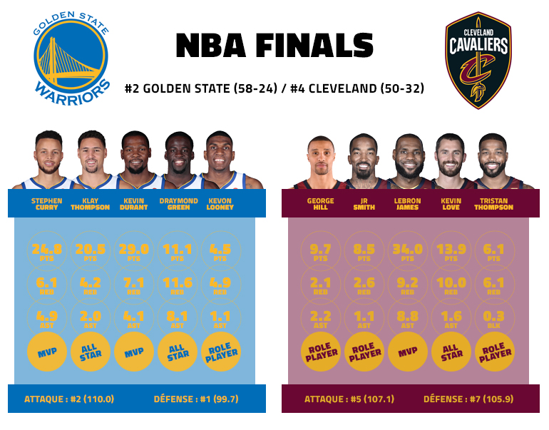 Après trois années de domination, les deux équipes ont toutefois dû s’employer pour revenir sur le devant de la scène. Derrière un LeBron James aussi stratosphérique qu’isolé, les Cavs ont eu besoin de sept matchs pour venir à bout des Pacers, avant de balayer Toronto sans l’avantage du terrain, et de remporter un septième match décisif à Boston, après avoir été mené 0-2 et 2-3, pour rejoindre la finale. Côté Warriors, si leur finale de conférence face à Houston s’est terminée de la même façon, avec une victoire à l’extérieur lors du Game 7, le reste de leur playoffs a été plus aisé malgré l’absence de Stephen Curry lors des six premiers matchs.