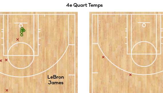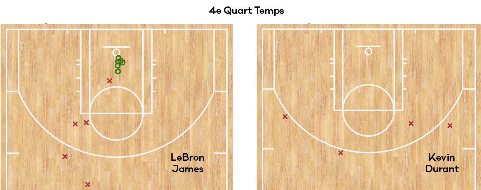 Il a pourtant fini la rencontre à 6/9 dans la raquette mais à 2/13 en dehors, dont 0/4 en dernier quart temps. Il s’est tout de même rattrapé en fin de match en allant deux fois sur la ligne de réparation en fin de match (dont ce fameux passage en force sifflé puis annulé…). Par comparaison, dans les mêmes circonstances, LeBron James a attaqué Stephen Curry et les pivots de Golden State sans relâche, terminant le seul dernier quart temps à 6/7 aux tirs dans la raquette.