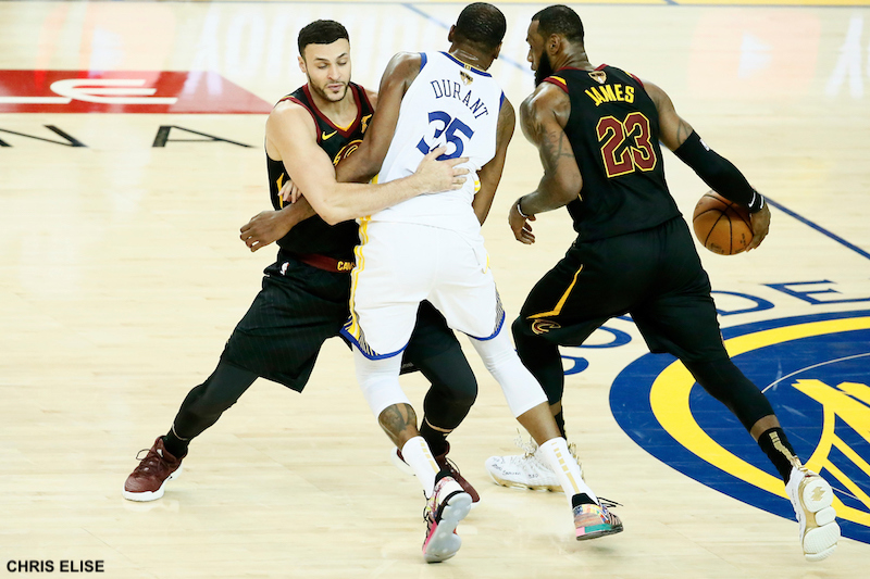 L’autre flèche à l’arc des Cavaliers qui ressemblait beaucoup à la stratégie utilisée par Mike D’Antoni était l’utilisation d’un switch agressif pour gêner Kevin Durant. Que ce soit face à des arrières ou face à Kevin Love, KD est retombé dans les travers de la finale de conférence. Face à une défense agressive et des mains basses actives, le MVP des finales 2017 a manqué de confiance dans sa dextérité. Il a ainsi privilégié les tirs difficiles à mi-distance et à 3-points plutôt que d’attaquer le cercle.