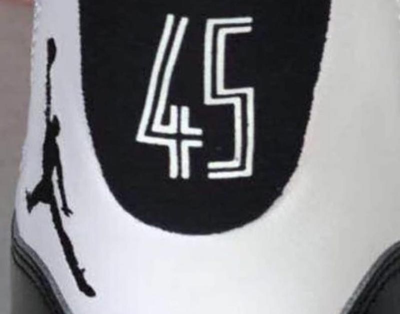 Et c’est donc avec ce numéro que Jordan a reçu ses premières paires de la mythique Air Jordan 11. Ce modèle qui, justement, va faire son retour au mois de décembre dans son premier coloris, le “Concord.” Au talon, plutôt que le 23, il a été décidé de rester fidèle à l’histoire et de placer le 45 sur cette réédition. C’est ce que montrent les premières photos volées de la chaussure.