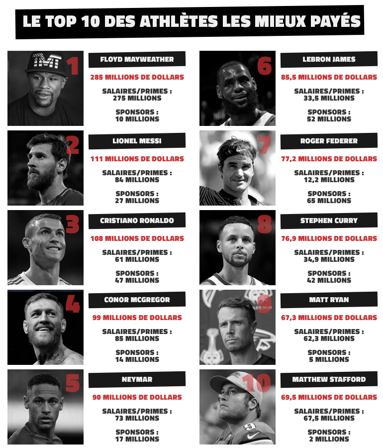 À la première place ? Le boxeur Floyd Mayweather, qui a touché 275 millions de dollars en une fois pour son combat face à Conor McGregor, qu’on retrouve lui à la 4e place avec 99 millions de dollars, dont 85 millions de dollars de revenus pour ses exploits sur un ring ou en MMA. Entre les deux combattants, deux footballeurs, Lionel Messi avec 111 millions de dollars de revenus, suivis de Cristiano Ronaldo (108 millions).