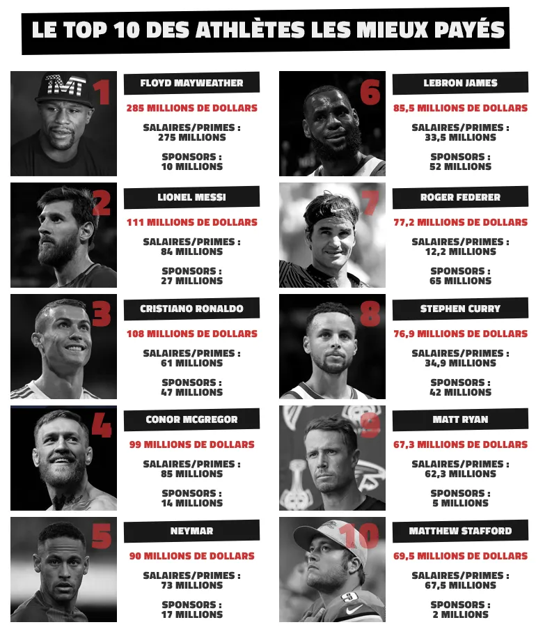 À la première place ? Le boxeur Floyd Mayweather, qui a touché 275 millions de dollars en une fois pour son combat face à Conor McGregor, qu'on retrouve lui à la 4e place avec 99 millions de dollars, dont 85 millions de dollars de revenus pour ses exploits sur un ring ou en MMA. Entre les deux combattants, deux footballeurs, Lionel Messi avec 111 millions de dollars de revenus, suivis de Cristiano Ronaldo (108 millions).