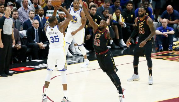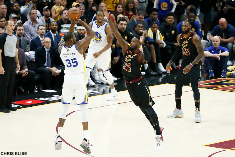 Il y a d’abord ce panier dans les ultimes secondes de la première période pour revenir à deux possessions et un petit signe à un fan des Cavs un peu trop « bruyant » à son goût… Les Cavaliers ont globalement maîtrisé la première mi-temps mais Kevin Durant est là pour mettre le doute dans la tête des fans de la Q Arena. Stephen Curry et Klay Thompson ne mettent pas un tir (3 sur 15 à la pause), et Draymond Green perd un peu les pédales avec trois fautes rapides.