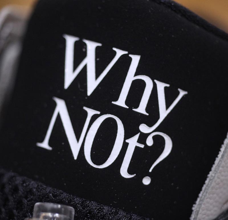 La tige est recouverte d’un motif métallisé. Sous le pied, la semelle se partage entre le noir et le orange. Entre les deux, la semelle intermédiaire est blanche. « Why not ? », le slogan du MVP 2017, est inscrit sur la languette.