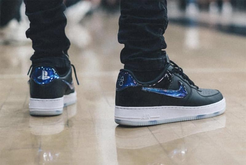 La base est simple, mais les détails font la différence. Nike a opté pour une empeigne noire et une semelle blanche. Le cuir est verni sur le talon. La console de Sony est à l’honneur grâce à une virgule bleu et, surtout, des talons décorés avec le logo PS et les symboles de la manette. La semelle translucide semble aussi reprendre des touches de bleu.
